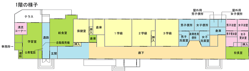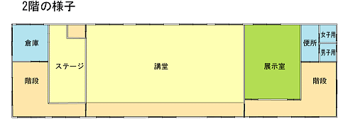 清流の家の1階には、厨房、和室10畳,20.5畳、15畳2室、6畳、浴室、(男女)トイレ、身障者トイレがあります。